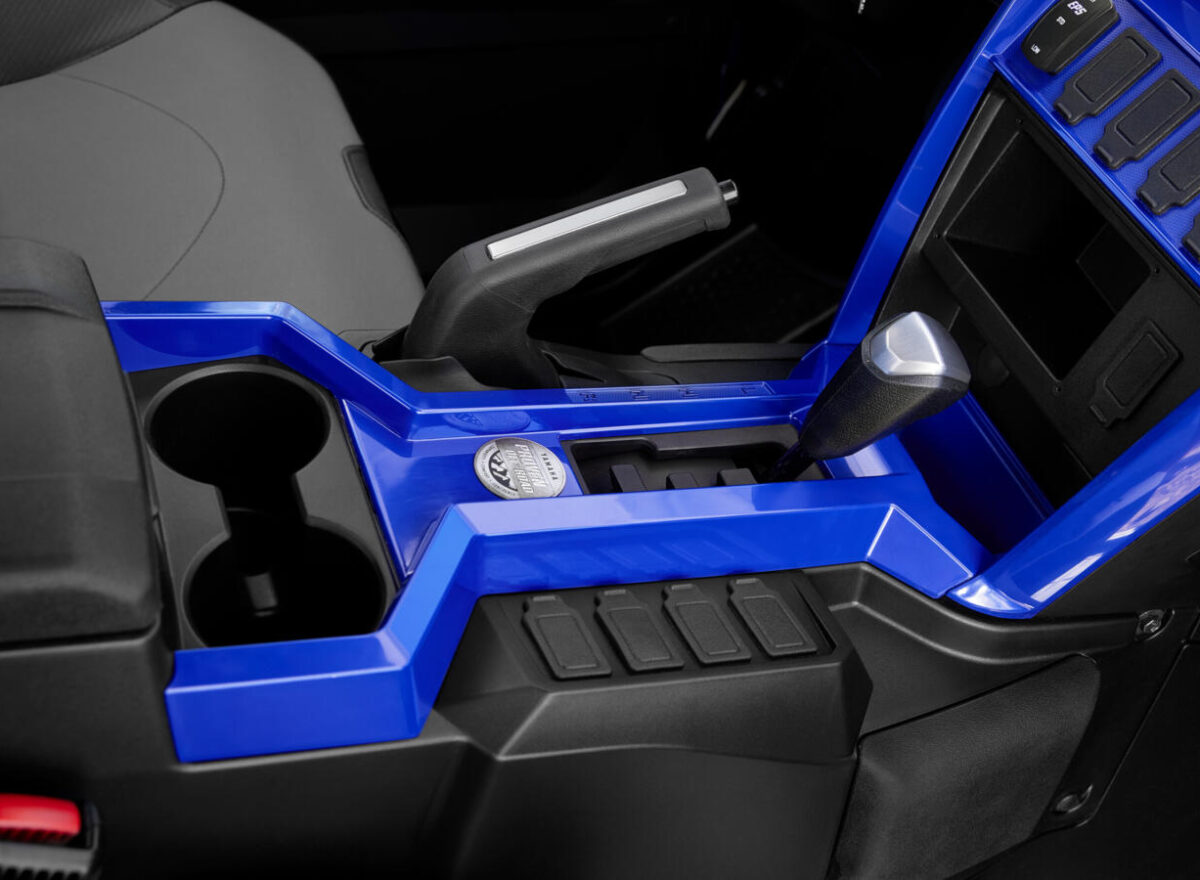 Striking in Team Yamaha Blue with stylish wheel accents, the Wolverine® RMAX™2 1000 Sport also offers a premium sport interior for comfort and style. With ultra-plush cut-and-sew seats in Yamaha Blue, both driver and passengers can tackle rugged backcountry adventures in ultimate comfort and style. Pair that with three drive modes and adjustable EPS and you’re set for anything the terrain can throw at you.