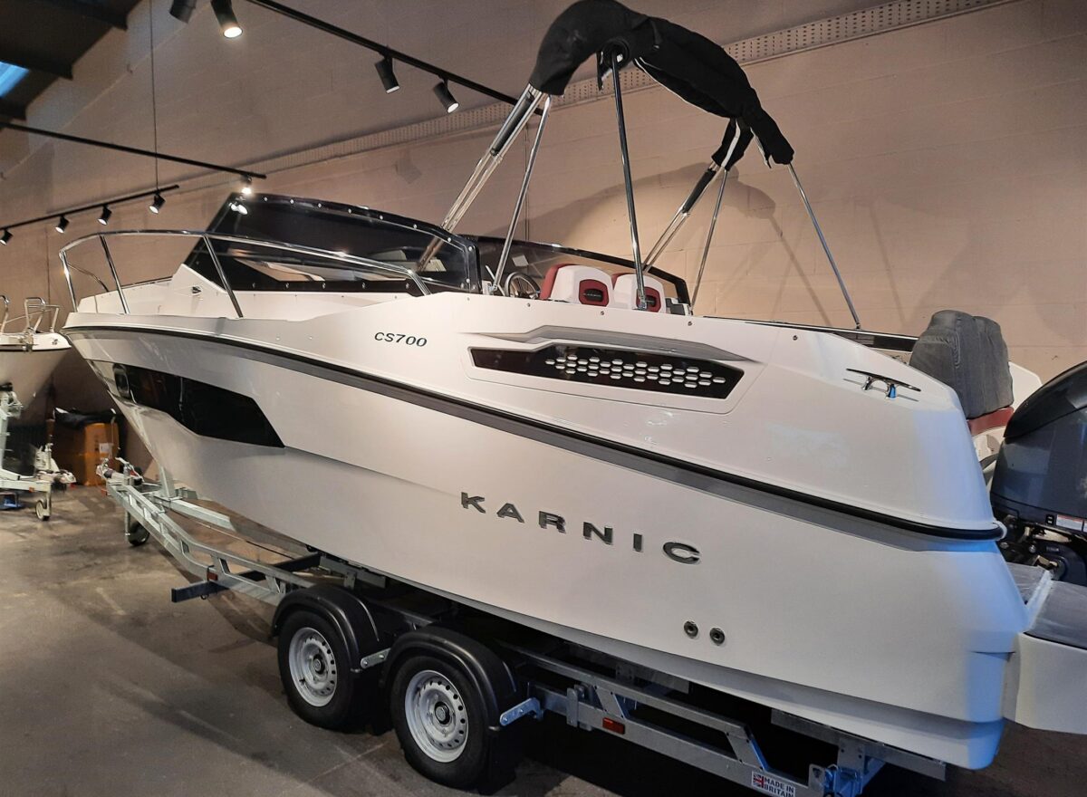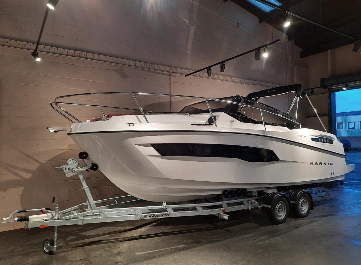The Karnic CS700 S is a highly capable walkaround cabin cruiser, offering the perfect balance of comfort, practicality, and performance. With a new 250hp Yamaha V6, a full suite of comfort, galley, and weather-protection upgrades, and a heavy-duty Extreme trailer, this package is ready for immediate enjoyment.