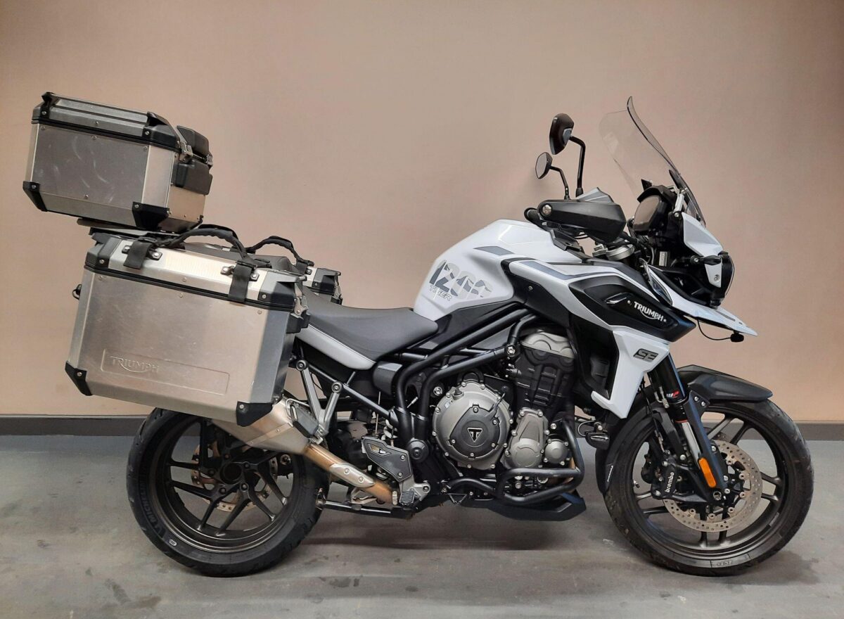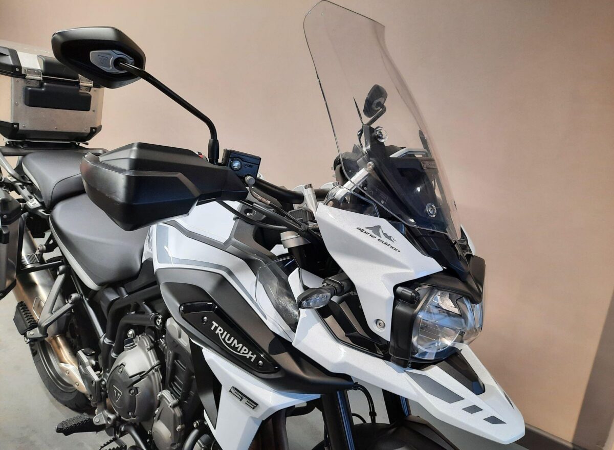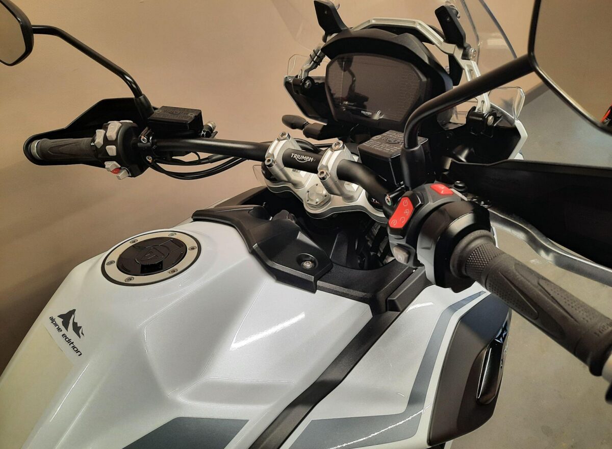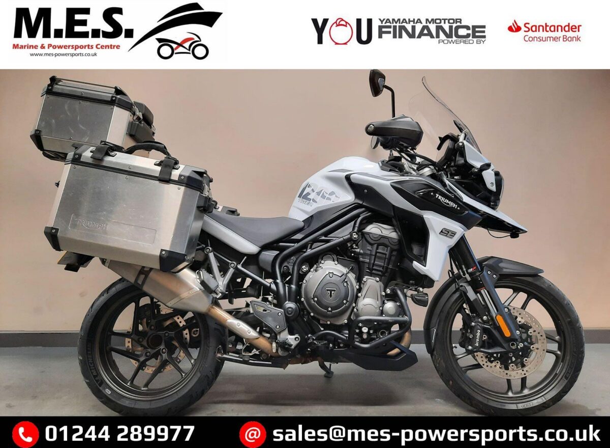 TRIUMPH TIGER 1200 ALPINE SE fitted with genuine Triumph aluminium top case and panniers. Special Edition Alpine model. Tiger 1200 Alpine Edition features all of the Tiger 1200 XR style and adventure capability, whilst bringing a higher standard of finish, including: Exclusive ‘Snowdonia White’ special edition paint scheme, ‘Alpine Edition’ graphics and Metallised ‘SE’ radiator badges. Based on the XRx model, the Tiger 1200 Alpine Edition adds even higher specification features with a Lightweight Arrow titanium silencer and Triumph Shift Assist for clutchless up- and down-shifts. Features… Shaft final drive. Full colour TFT display. Optimised Cornering ABS and Traction Control. 4 rider modes (Rain, Road, Off-Road, Sport). All LED lighting. High specification Triumph Semi-Active Suspension (TSAS). Triumph Shift Assist. Keyless ignition. Cruise control. Hill Hold. Electrically adjustable touring screen. Ride-by-wire throttle. Heated grips. Hand Guards. Main Stand. Three power sockets including a handy USB socket under the seat. One owner UK bike in very good condition and with full service history. Comes complete with 1 smart remote key, 2 mechanical back up keys, owners manual and service book. Will be serviced and supplied with MOT and 3 months warranty. UK Nationwide Delivery and finance available. Part exchange welcome. Whatsapp 07930 475012 or CALL US NOW 01244 289977…