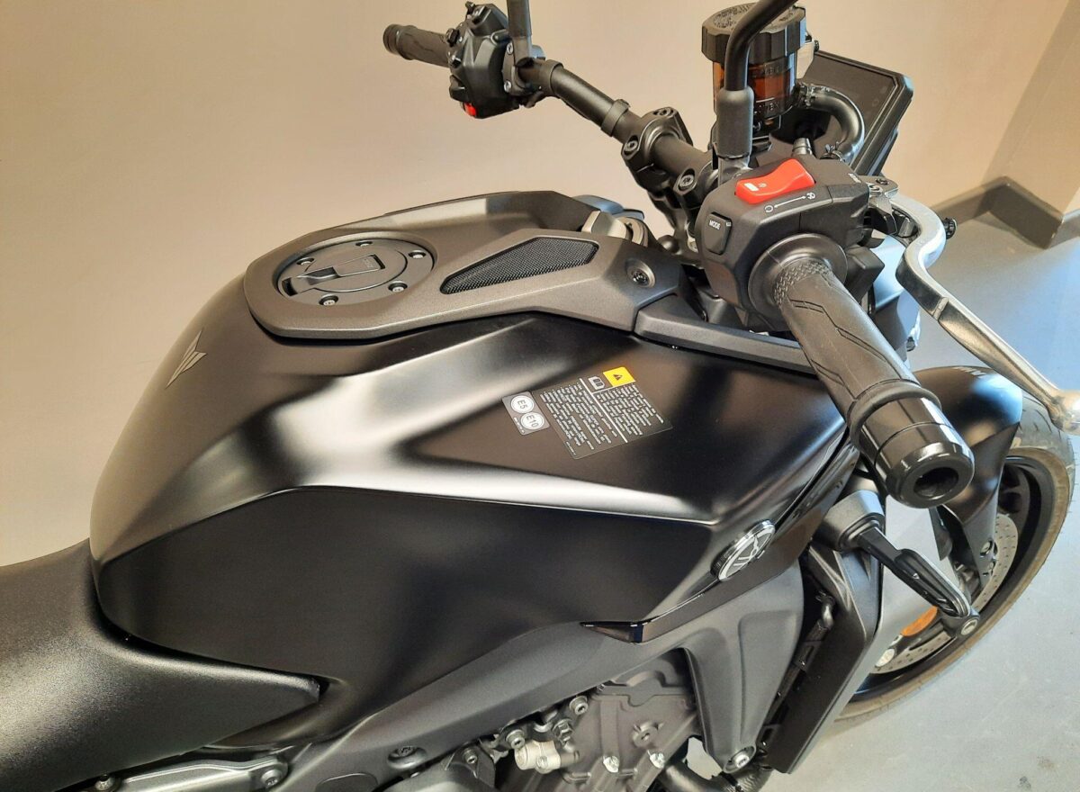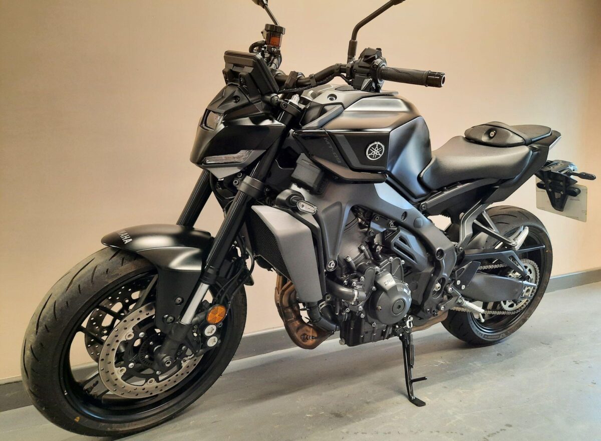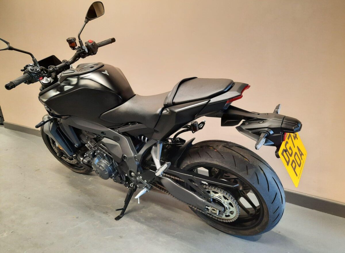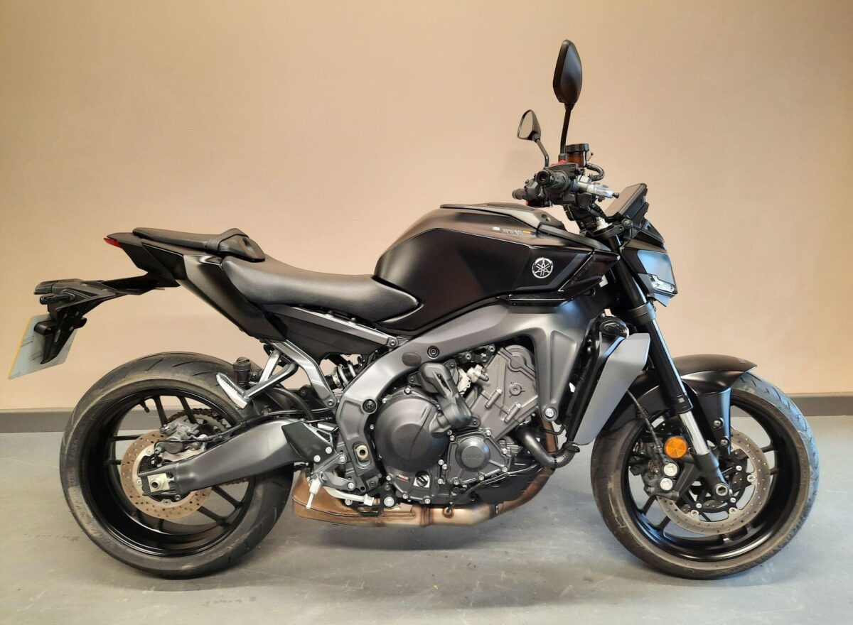 YAMAHA MT-09 Y-AMT in Tech Black. Yamaha Automated Manual Transmission (Y-AMT) gives you the choice of finger operated manual shift (MT) or a two-mode fully automatic transmission (AT). Two automatic riding modes, D mode delivers a softer gear shift experience and D+ mode for more sporty and aggressive gear shifting later in the rev range. Features… Latest 890cc three-cylinder four valve DOHC liquid-cooled EU5+ CP3 engine, Six axis IMU with lean sensitive rider aids. Smart Key keyless ignition system. New 5” full colour TFT screen with Bluetooth smart phone connectivity via the Yamaha MyRide app for audio playback, phone calls, weather updates and turn by turn navigation. Cruise Control. Premium adjustable KYB front forks. Customisable riding experience via Yamaha Ride Control (YRC) allowing you to select engine power characteristics and the level of electronic intervention to suit your preferences and road conditions. Three integrated riding modes are programmed with factory settings to suit different situations: SPORT, STREET and RAIN; but you can also create two custom programmes to suit your individual preferences. 4 adjustable Power levels, 3 stage Traction Control, 3 stage Slide Control System, 3 stage Lift control and Brake Control.