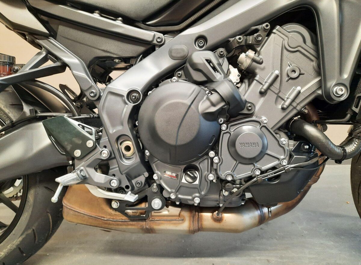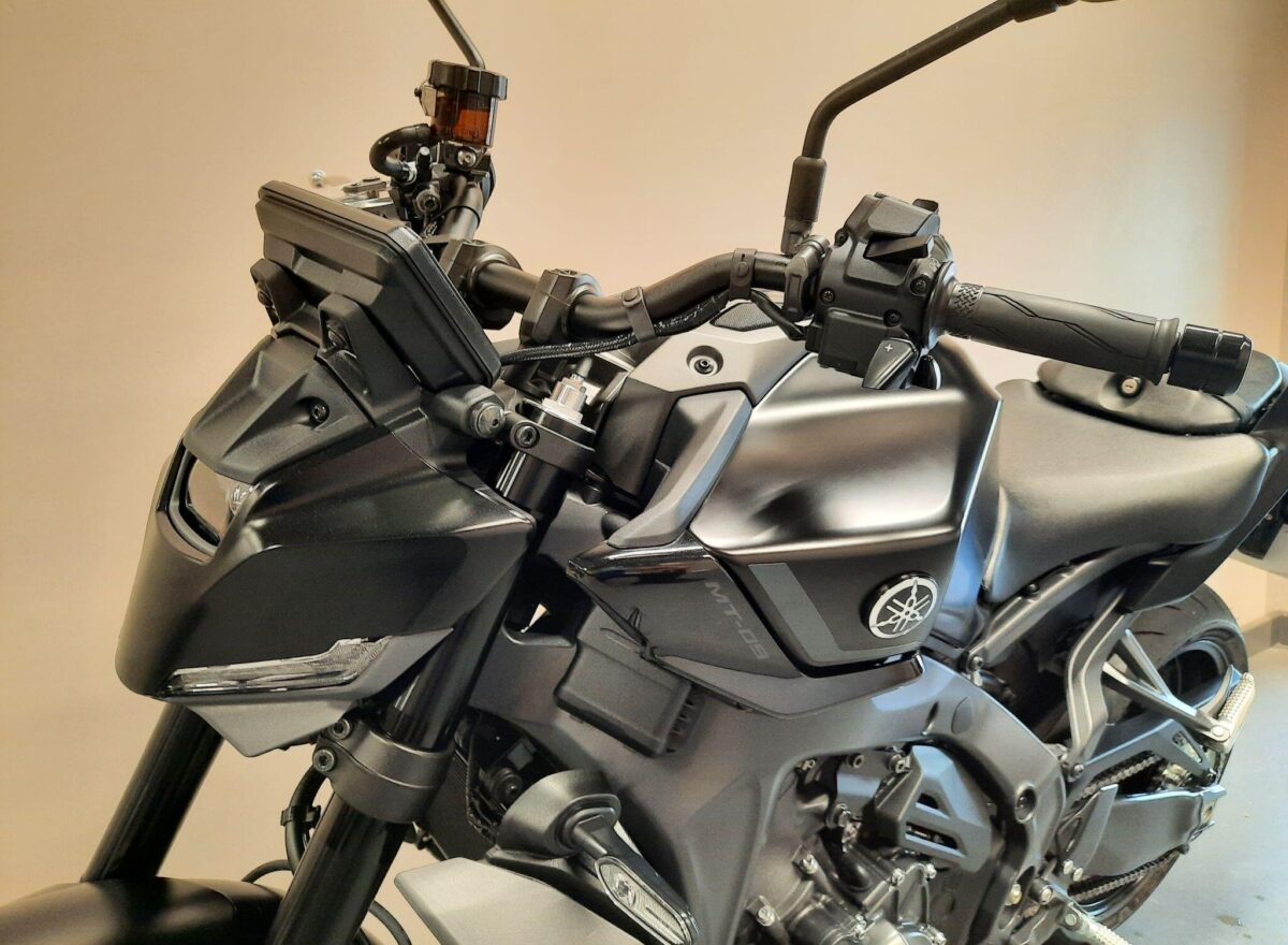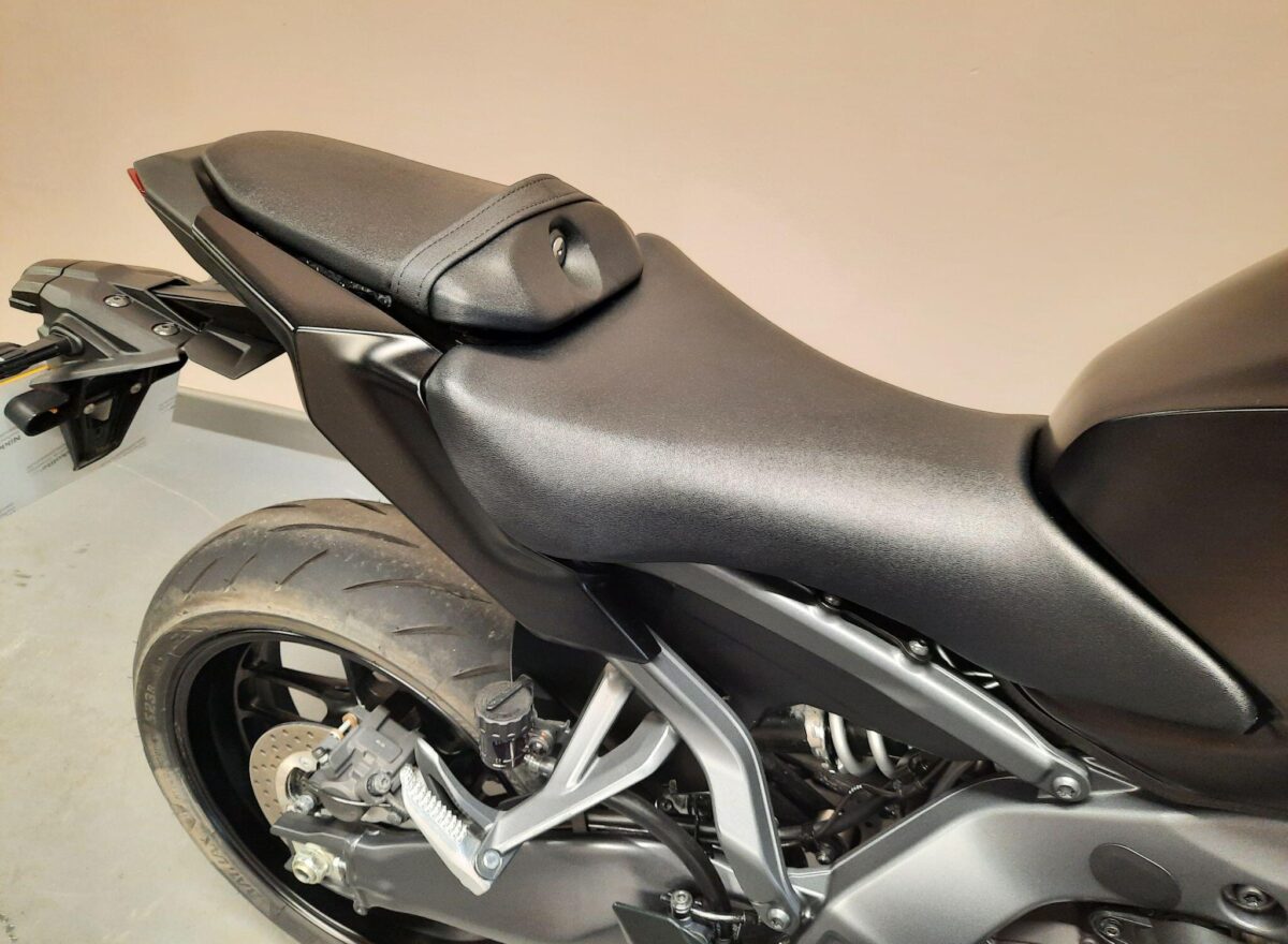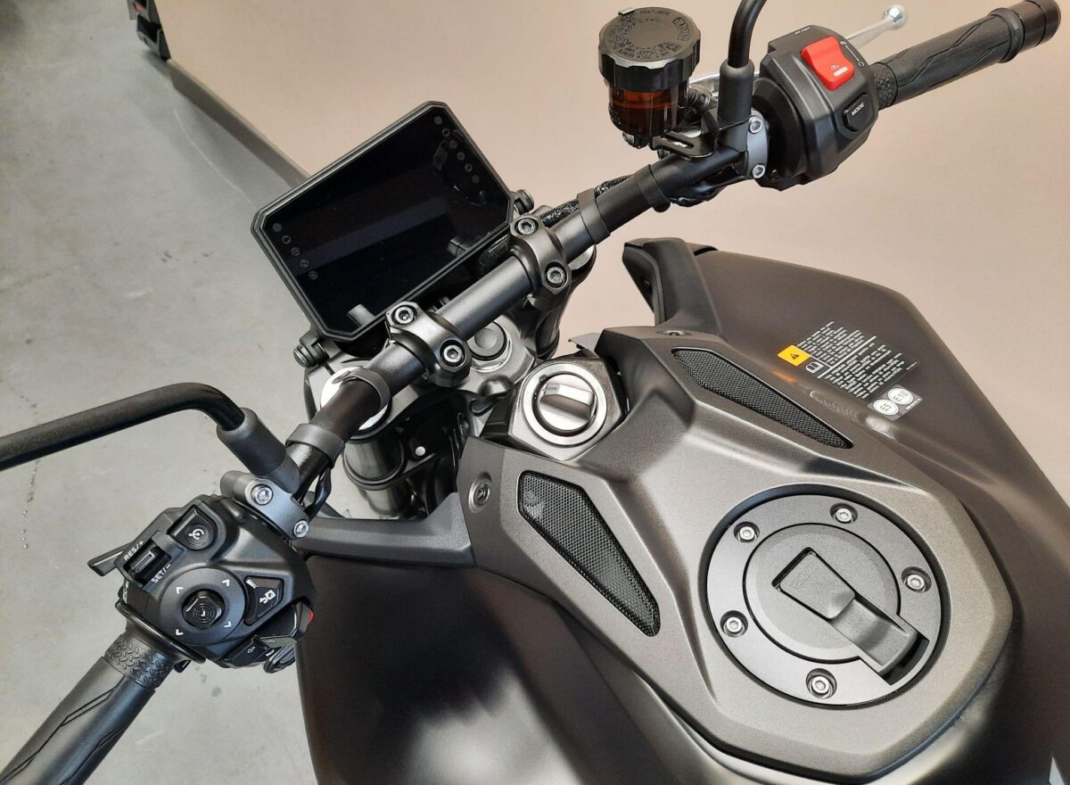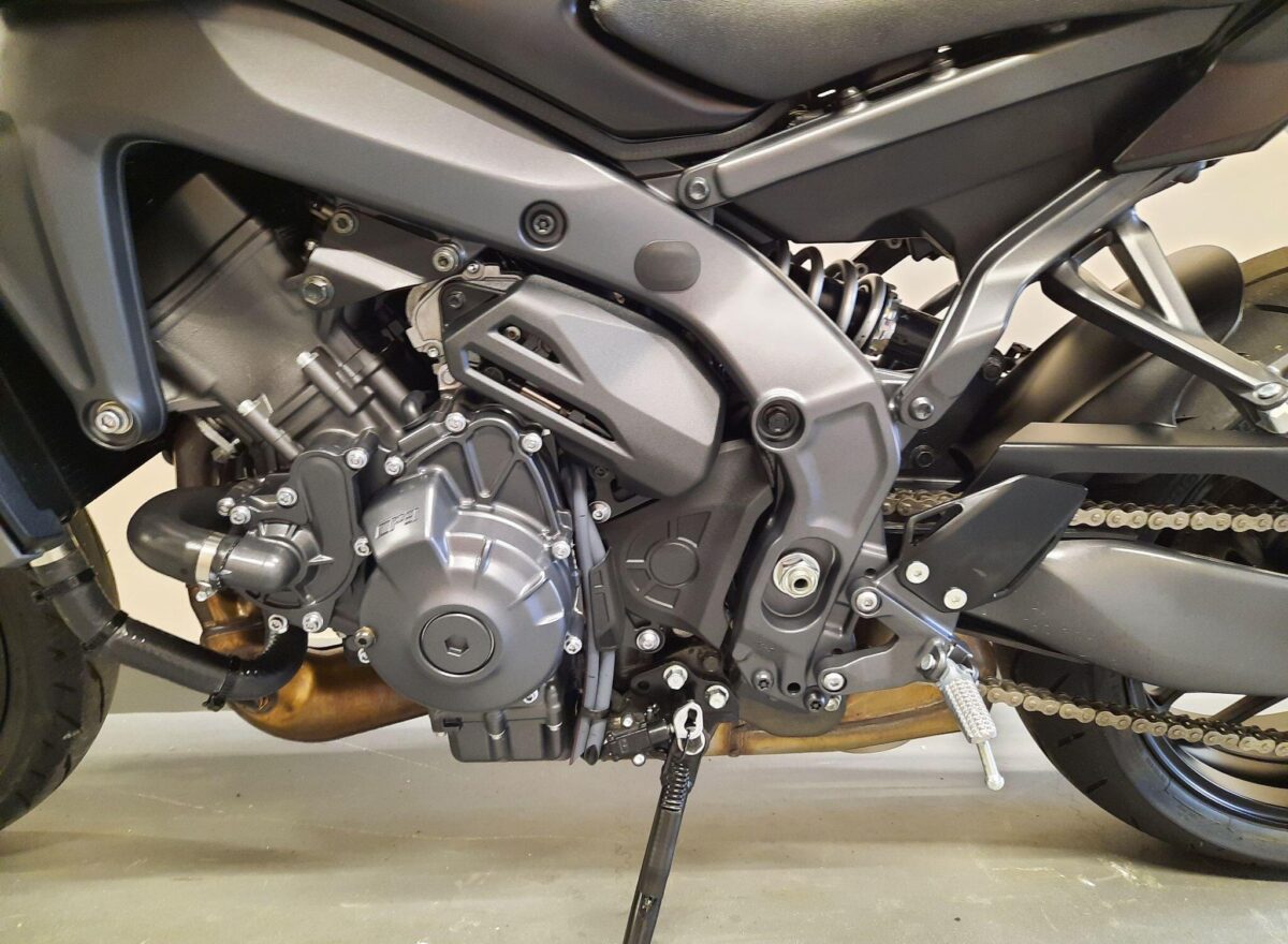 YAMAHA MT-09 Y-AMT in Tech Black. Yamaha Automated Manual Transmission (Y-AMT) gives you the choice of finger operated manual shift (MT) or a two-mode fully automatic transmission (AT). Two automatic riding modes, D mode delivers a softer gear shift experience and D+ mode for more sporty and aggressive gear shifting later in the rev range. Features… Latest 890cc three-cylinder four valve DOHC liquid-cooled EU5+ CP3 engine, Six axis IMU with lean sensitive rider aids. Smart Key keyless ignition system. New 5” full colour TFT screen with Bluetooth smart phone connectivity via the Yamaha MyRide app for audio playback, phone calls, weather updates and turn by turn navigation. Cruise Control. Premium adjustable KYB front forks. Customisable riding experience via Yamaha Ride Control (YRC) allowing you to select engine power characteristics and the level of electronic intervention to suit your preferences and road conditions. Three integrated riding modes are programmed with factory settings to suit different situations: SPORT, STREET and RAIN; but you can also create two custom programmes to suit your individual preferences. 4 adjustable Power levels, 3 stage Traction Control, 3 stage Slide Control System, 3 stage Lift control and Brake Control.